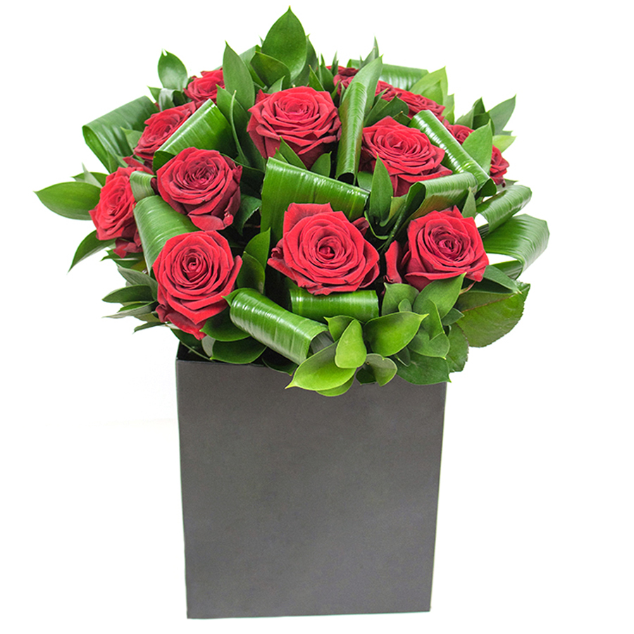 Elevate your décor with our sophisticated bouquet, featuring a harmonious blend of red roses, aspidistra leaves, and ruscus. Each flower is hand-picked to ensure superior freshness and lasting beauty.